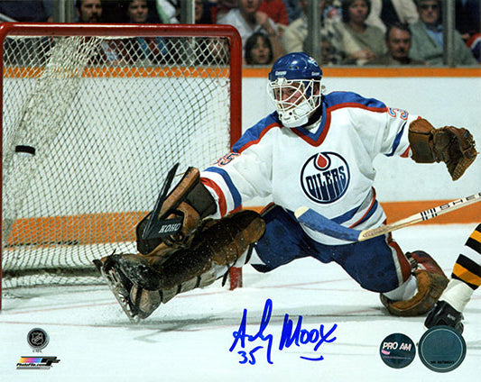Andy Moog Edmonton Oilers Signed Home White Action Kick Save 8x10 Photo