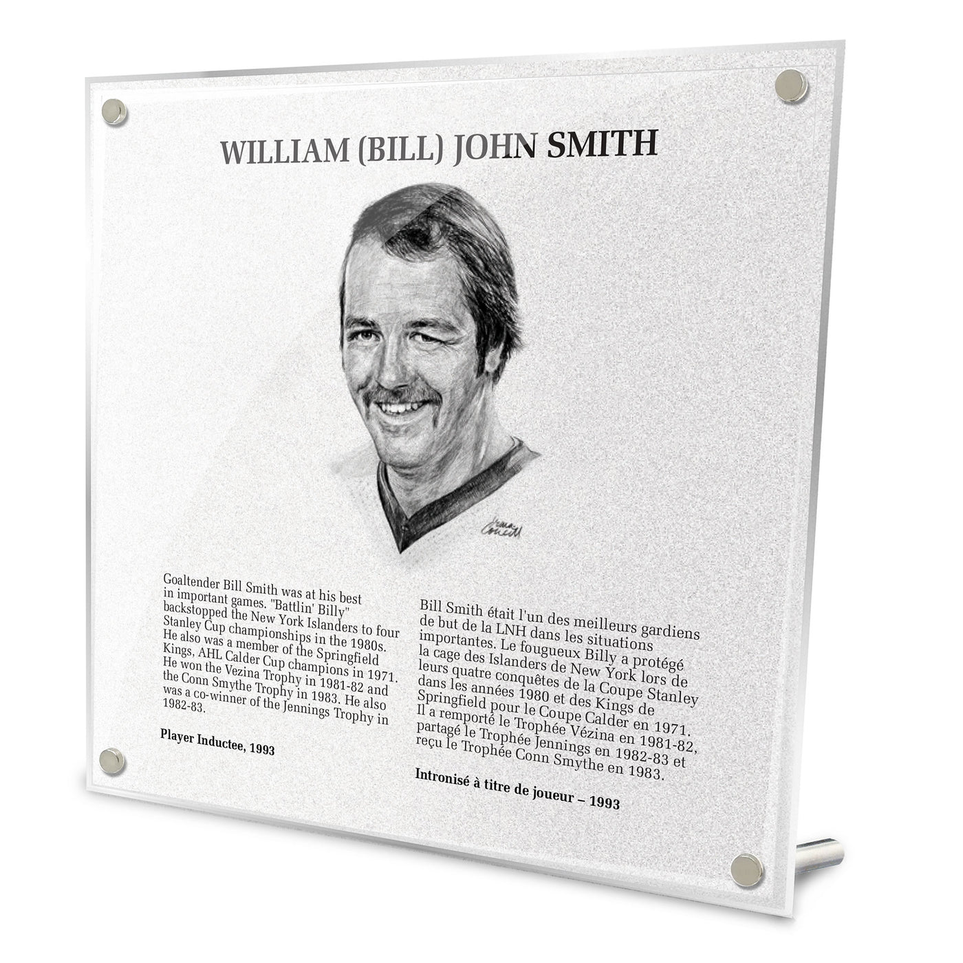 Acrylic replica of the frosted plaque that resides in the Great Hall in the Hockey Hall of Fame. Plaque includes an illustrated portrait as well as biography in English and French.