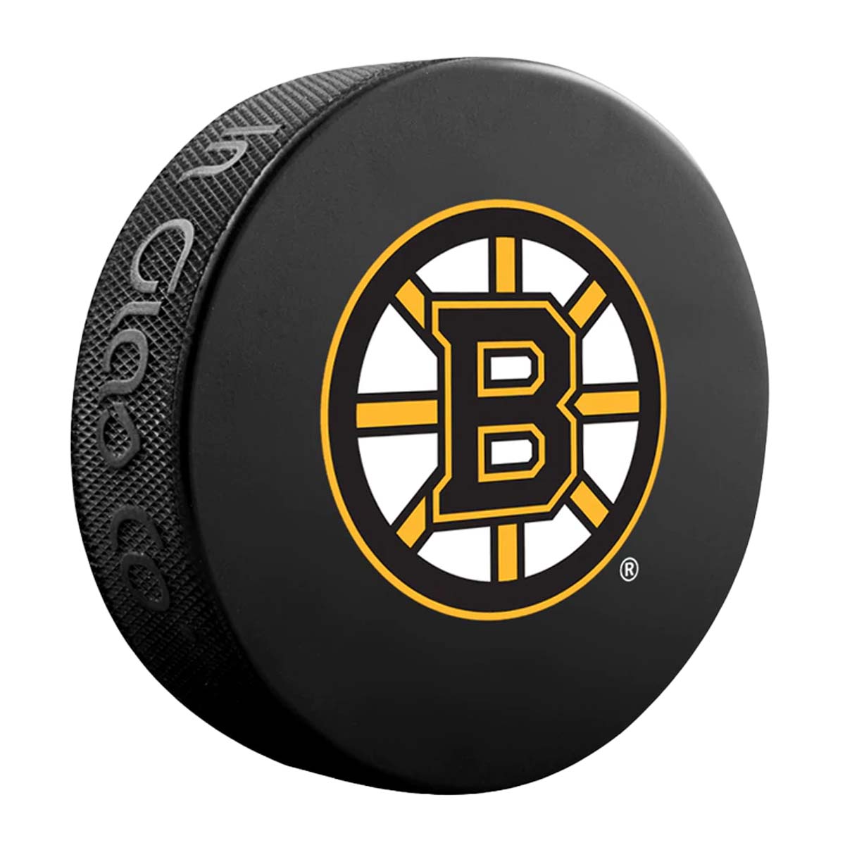 This black souvenir puck features the Boston Bruins' logo boldly filling the face of the puck.
