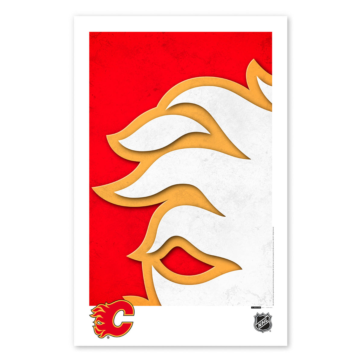 Illustrated by S. Preston, this poster design is a minimalist reimagining of the Calgary Flames logo, focusing on the iconic orange and white flames on a red background..