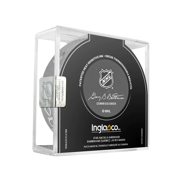 The presentation-worthy acrylic cube showcases the Flames' logo silkscreen printed with Inglasco's special process. The back of the puck features the NHL Shield printed with the same patented heat sensitive ink used in every NHL Game- it turns purple when frozen!