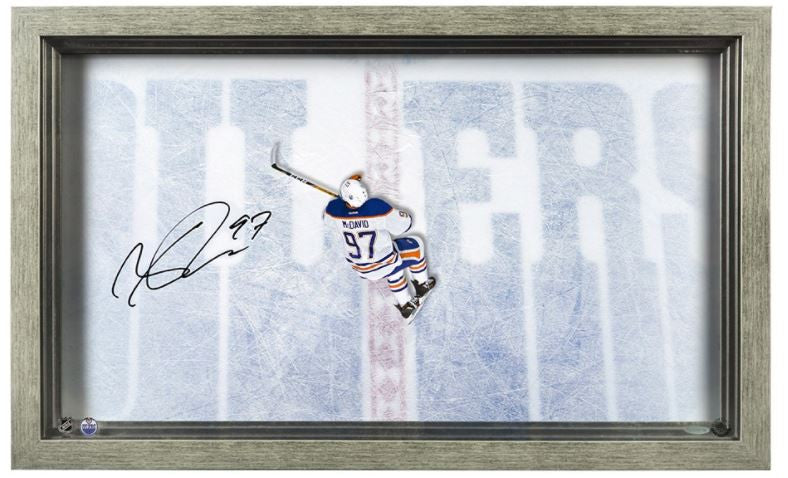 This item features an acrylic display that has been signed by Connor McDavid, and has been framed in a thick, classy, metal frame. The design and shadow reflect off the back layer, giving it an authentic, ice rink feel. Frame dimensions are approx. 30.5" x 18.5".