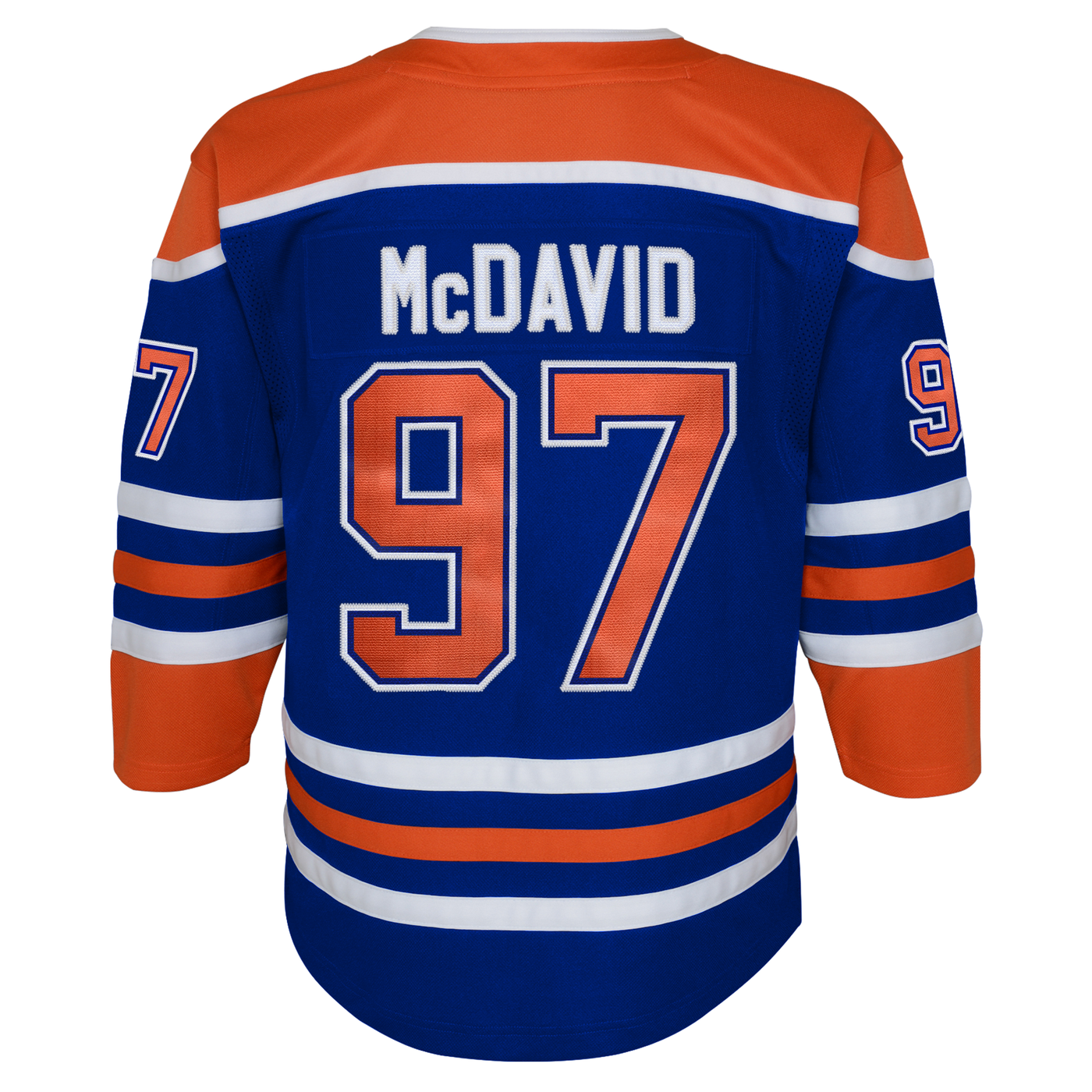 Connor McDavid Edmonton Oilers Youth Home Royal Blue Premier Replica Jersey crested with Name, and #97, and Captain's "C".