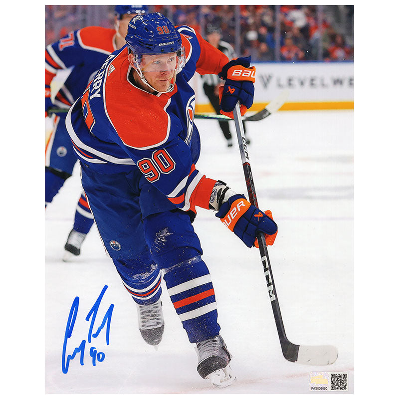Corey Perry Edmonton Oilers Blue Home Action Shooting Autographed 8x10 Photo.
