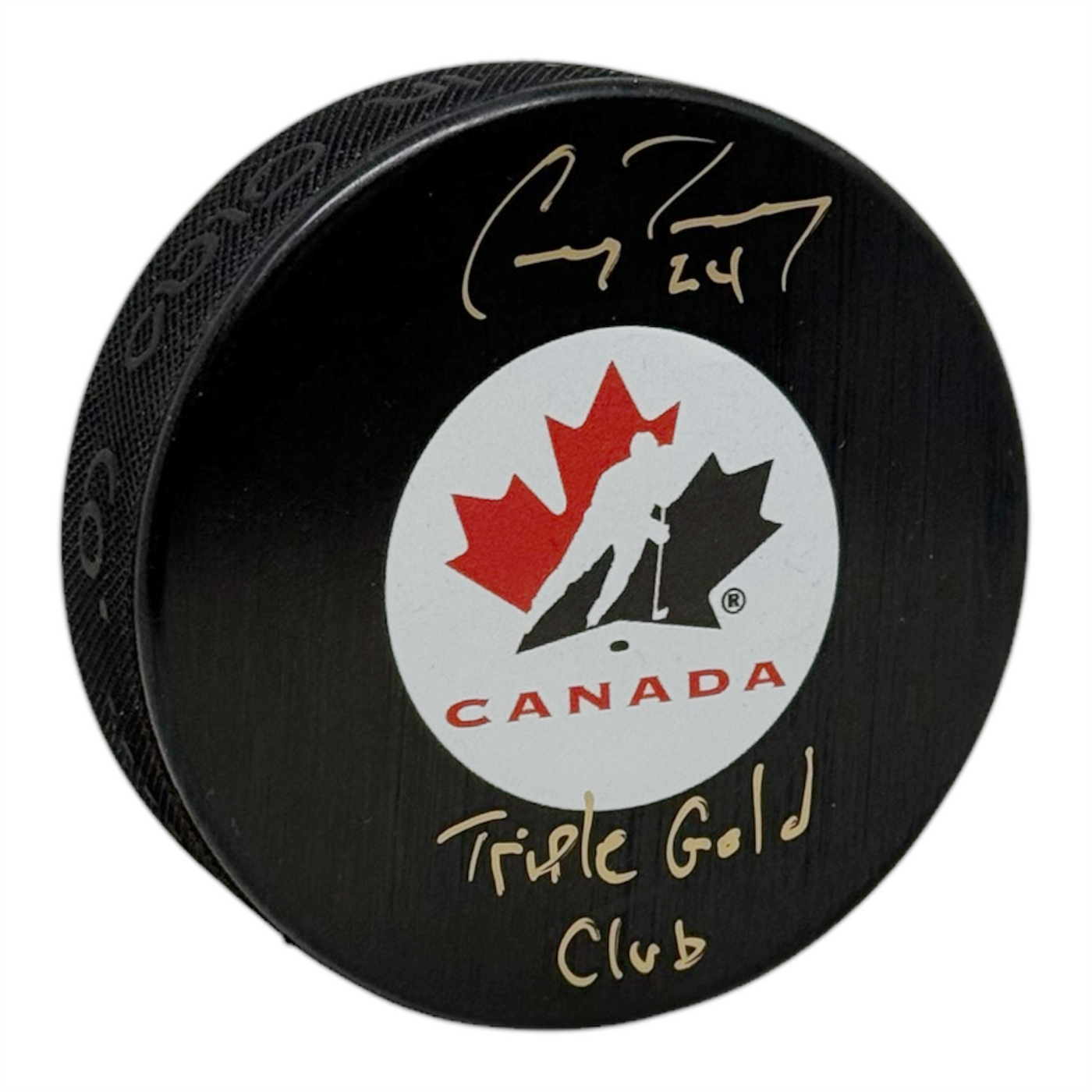 Corey Perry Signed Team Canada Puck Mid Size Logo Inscribed "Triple Gold Club"