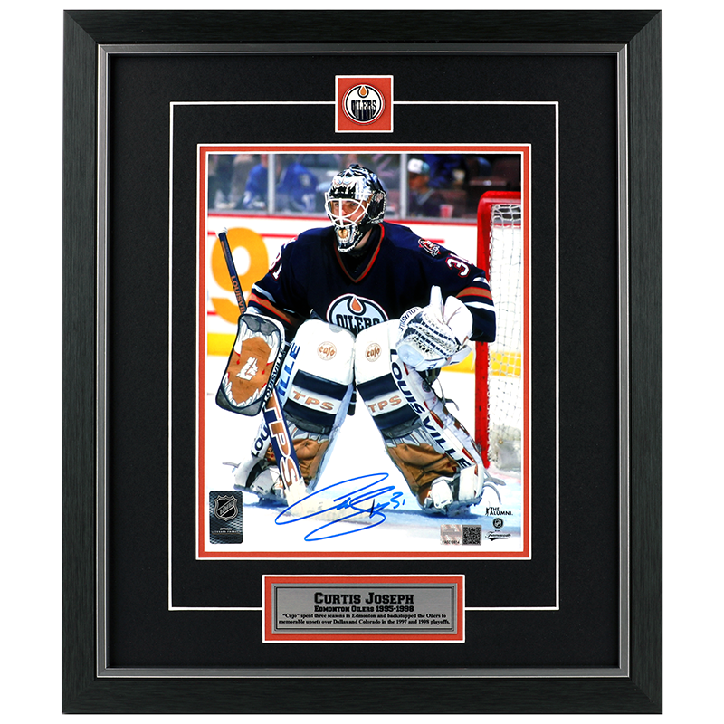 Curtis Joseph Edmonton Oilers Navy - Oilman Era, Watching The Play - Autographed 8x10 Photo.