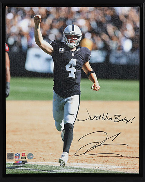 Derek Carr Oakland Raiders Black Action "Just Win Baby" Celebration autographed 16x20 canvas framed with a float and unique modern frame. This canvas has been inscribed "JUST WIN BABY".