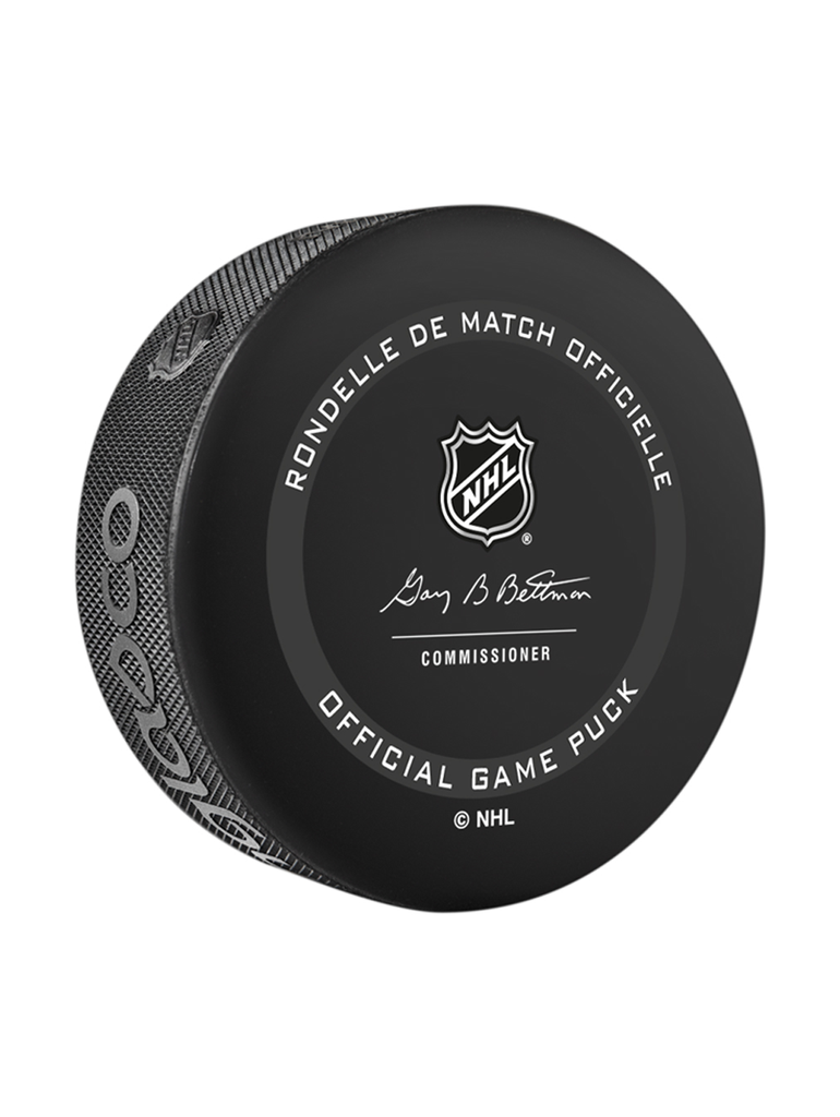 Canadian 6-ounce puck with official NHL game puck design and team logo in center, 3 inches in diameter. Puck features colour-changing temperature sensitive ink.