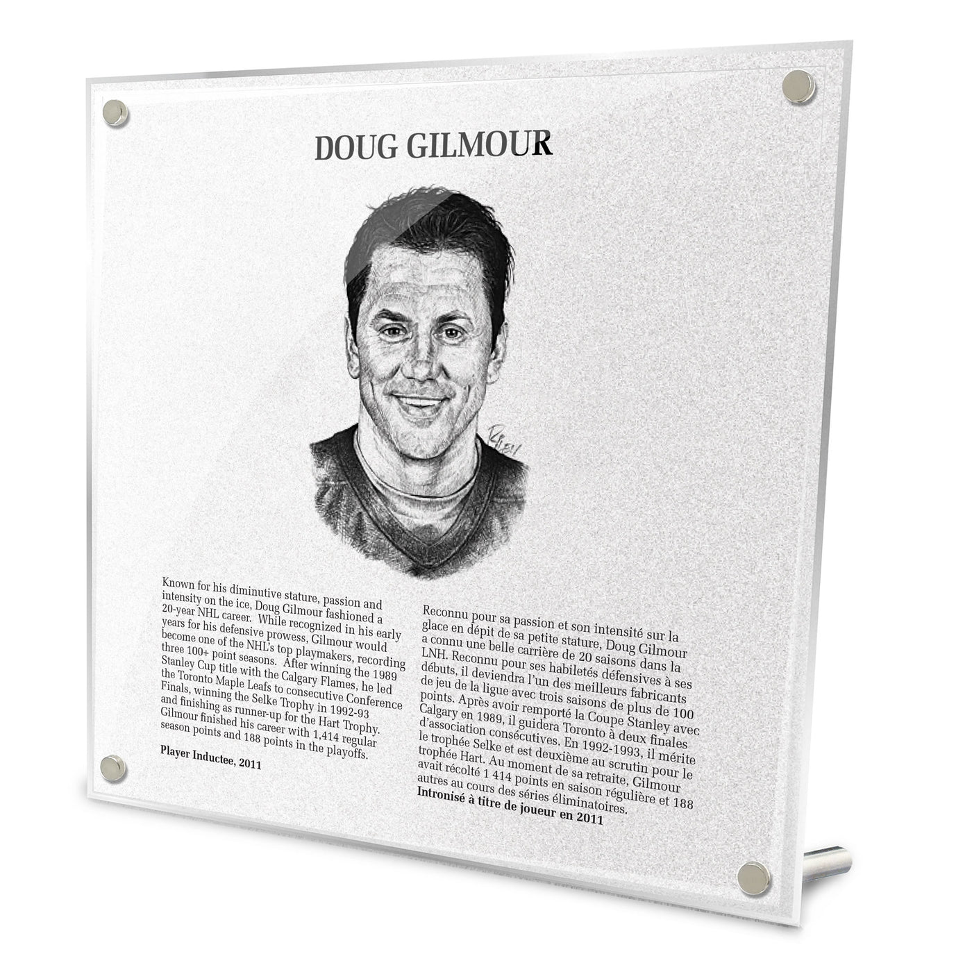 Acrylic replica of the frosted plaque that resides in the Great Hall in the Hockey Hall of Fame. Plaque includes an illustrated portrait as well as biography in English and French.