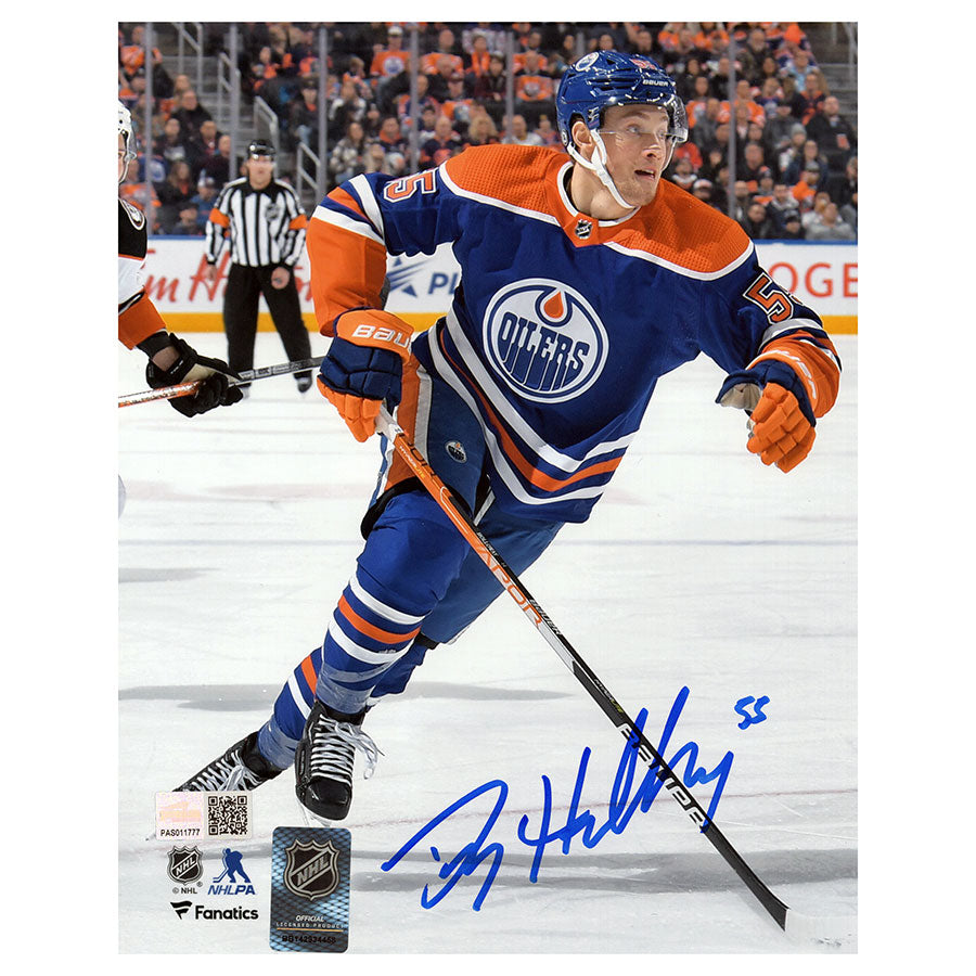 Dylan Holloway Edmonton Oilers Royal Blue "Home Action" Autographed 8x10 Photo.