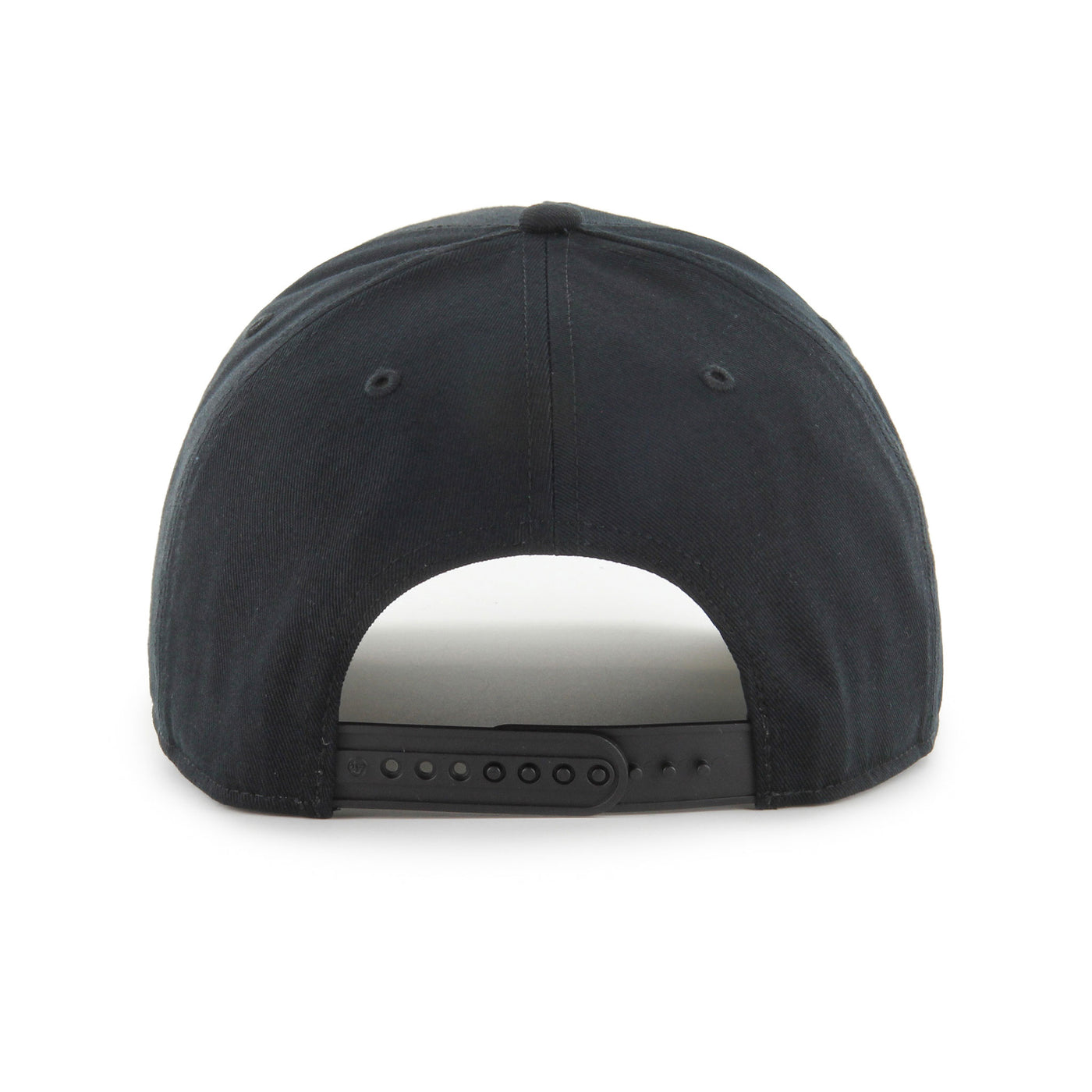 The Black & White Sure Shot '47 Hitch is a structured and curved adjustable hat with raised embroidery on the front, Oilers embroidered wordmark on the right side and a plastic snapback closure.