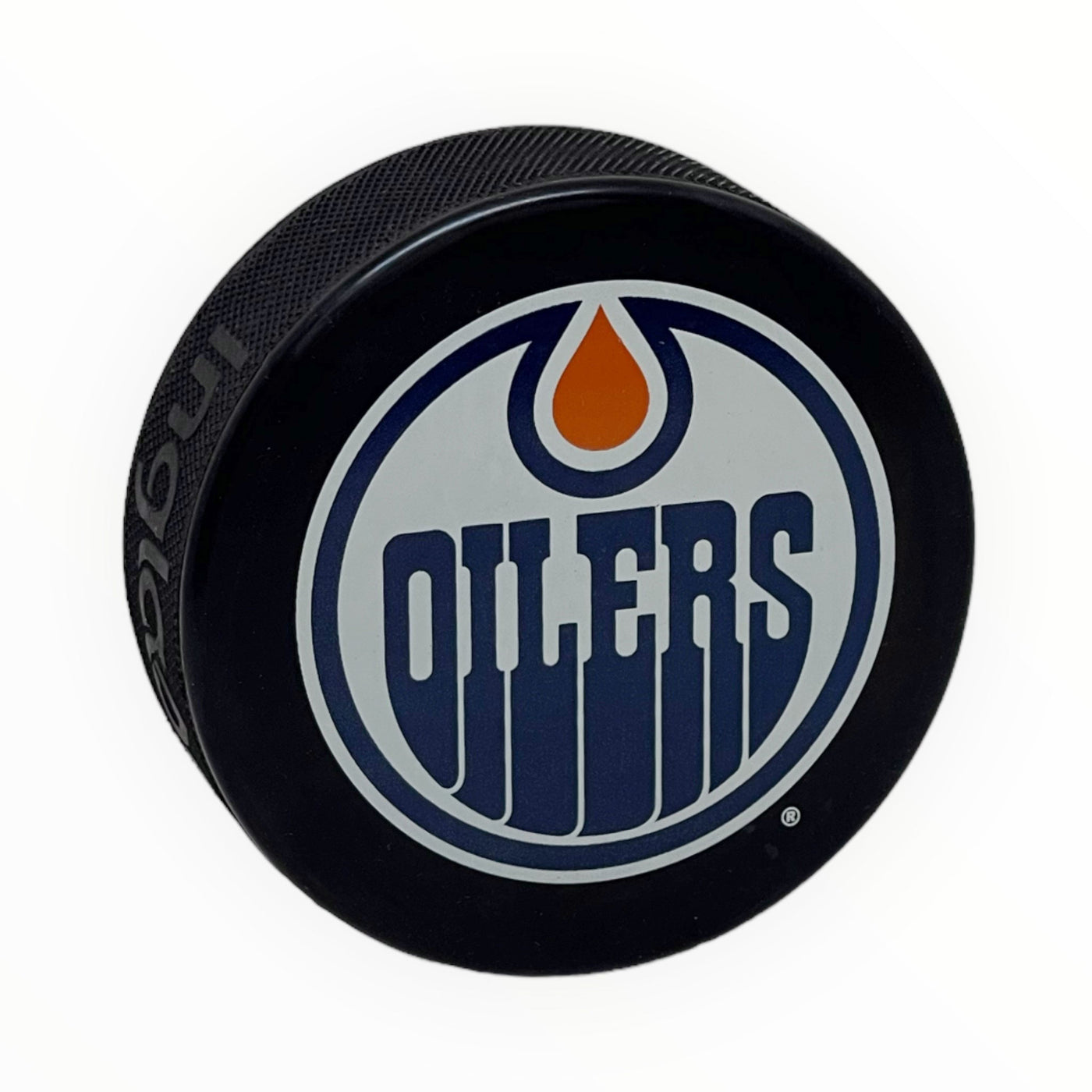 This black souvenir puck features the Edmonton Oilers' logo boldly filling the face of the puck.