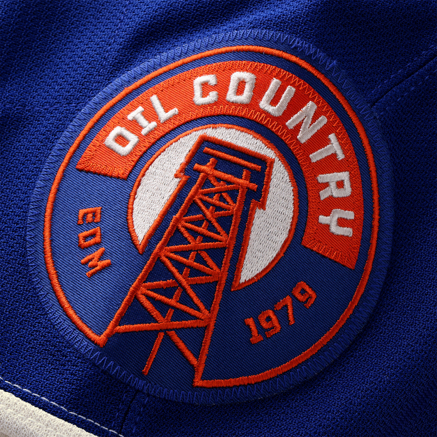 Sewn-down tackle twill Oilers alternate wordmark with high definition flat embroidered shoulder patch