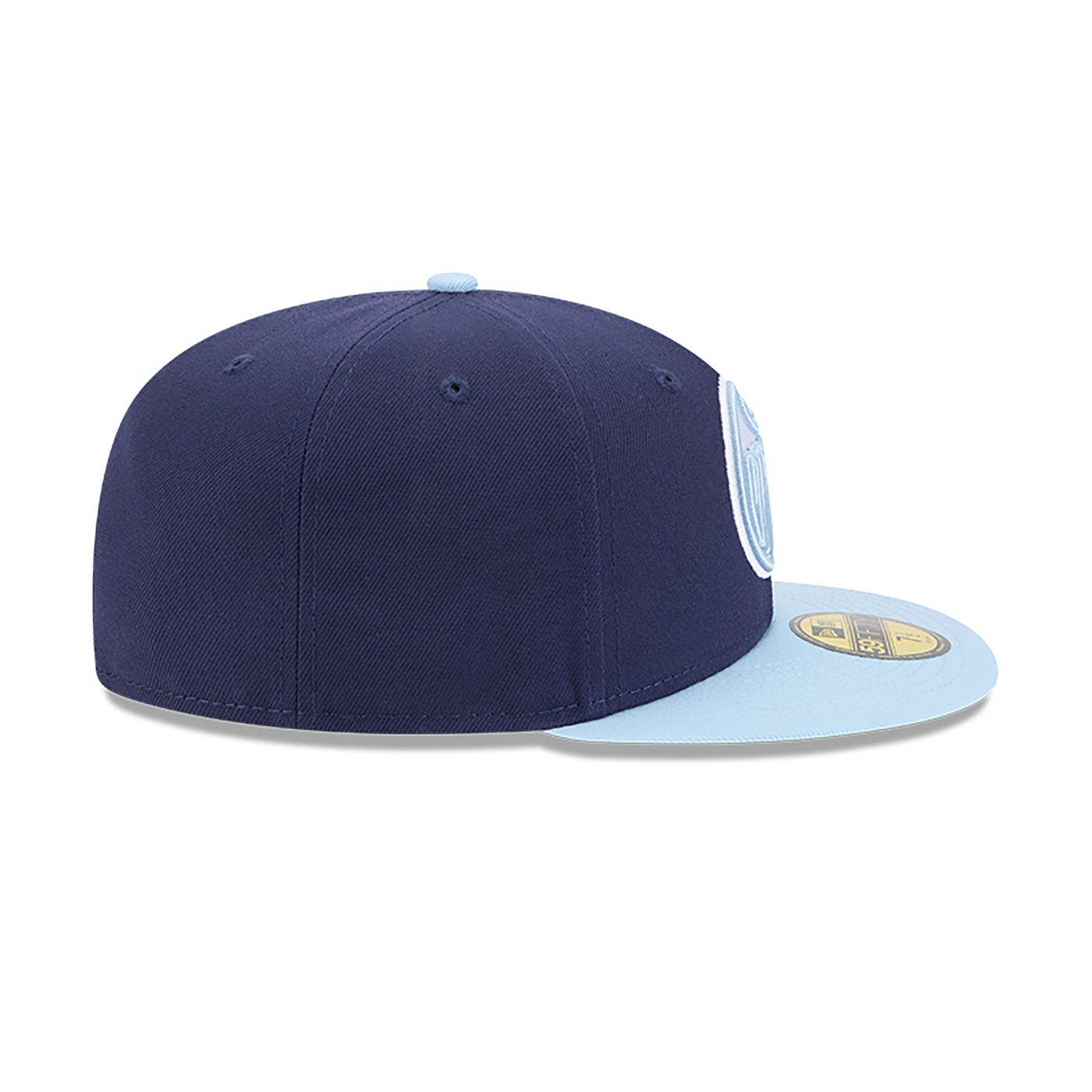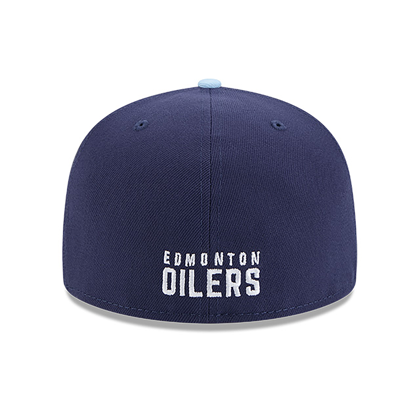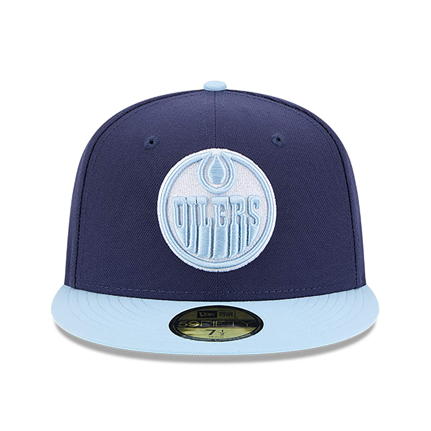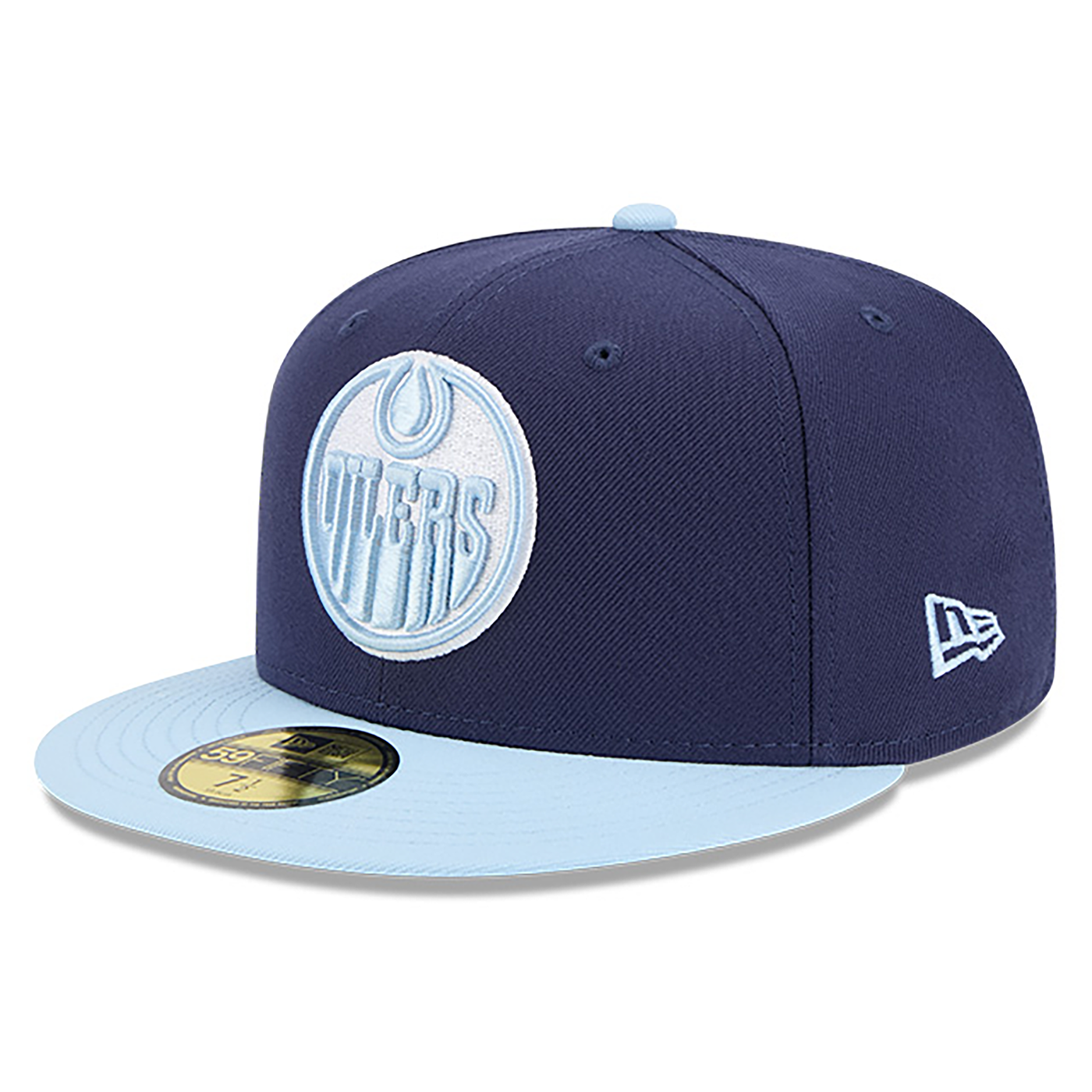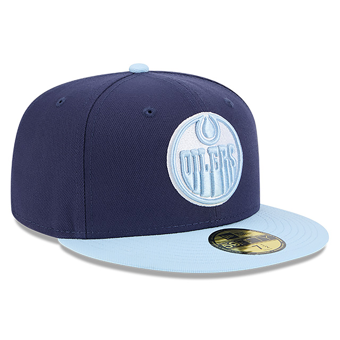 The Edmonton Oilers Color Pack Navy Glacial 59FIFTY Fitted Cap features an embroidered Oilers logo at the front panels with a matching team color Oilers wordmark at the rear and a gray undervisor.