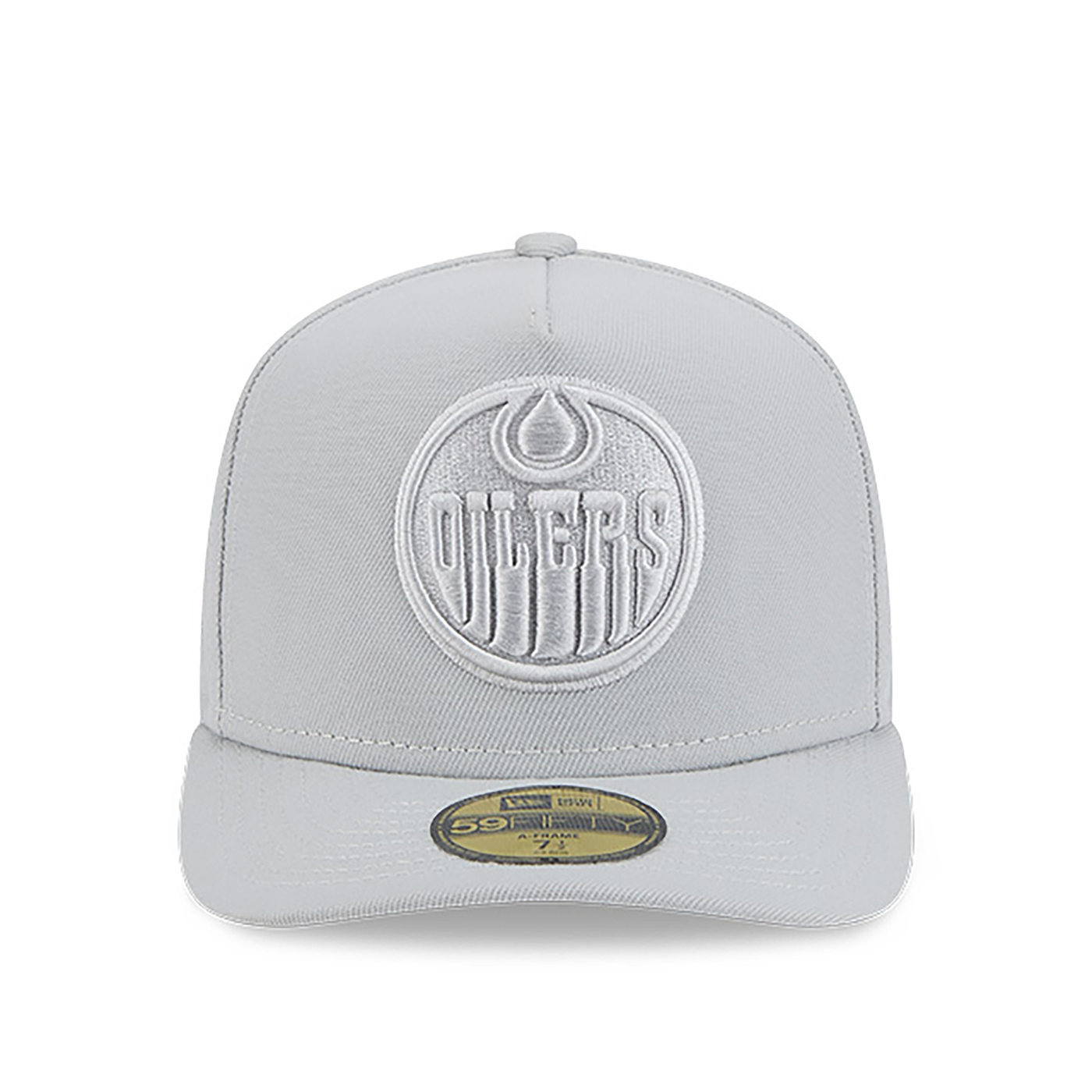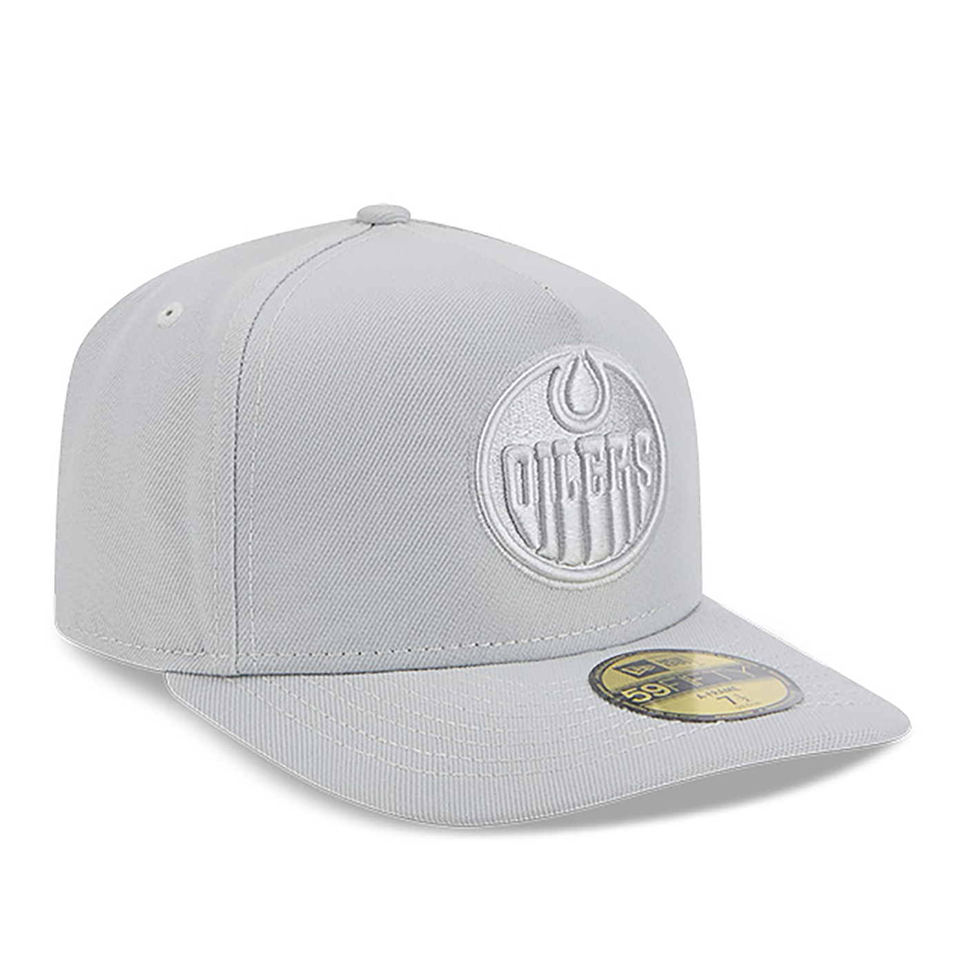 The Edmonton Oilers Color Pack Stone Grey 59FIFTY A-Frame Fitted Cap features an embroidered Oilers tonal logo on the front panel with a matching tonal Oilers wordmark at the rear and a gray undervisor.