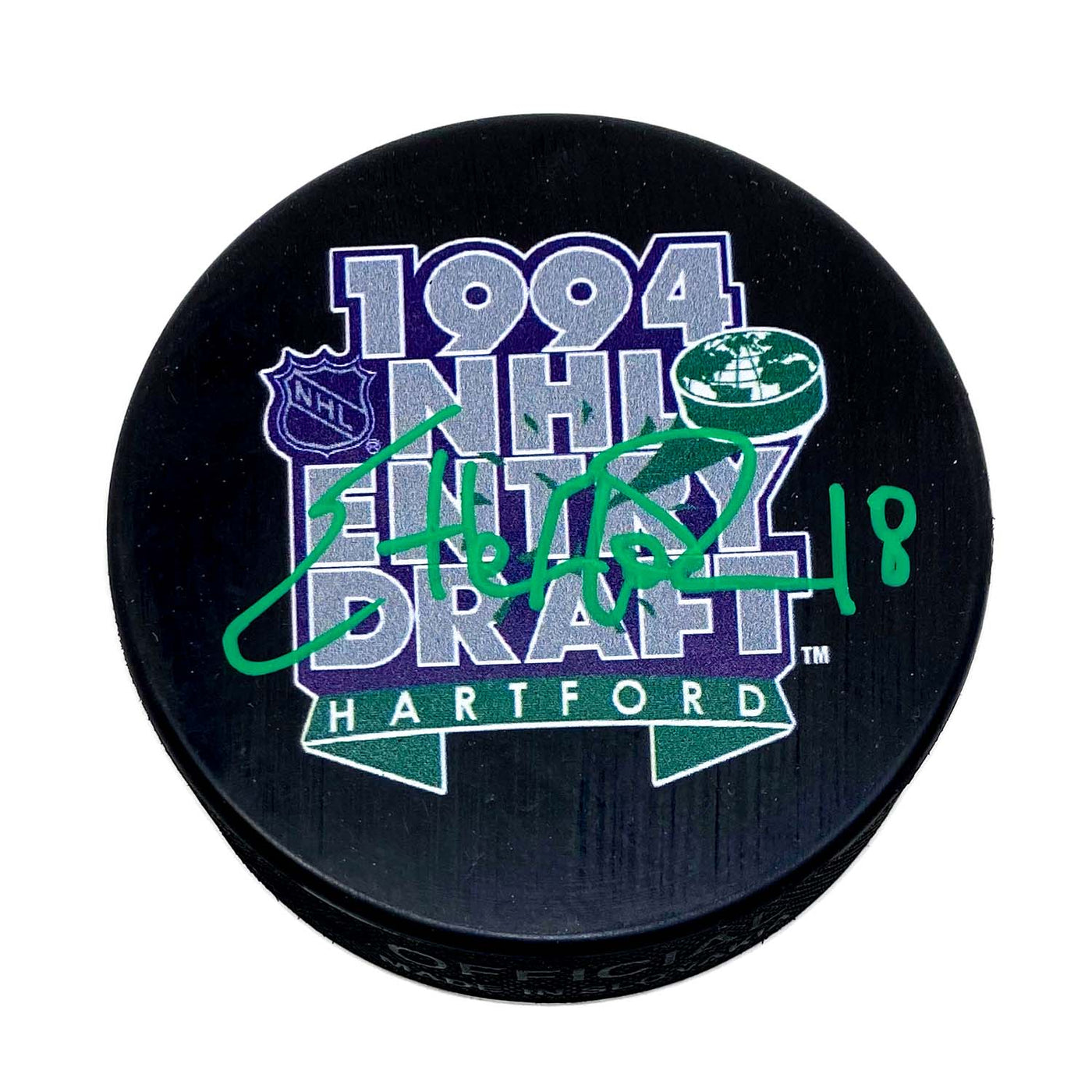 1994 Hartford Draft puck signed in green with inscription.