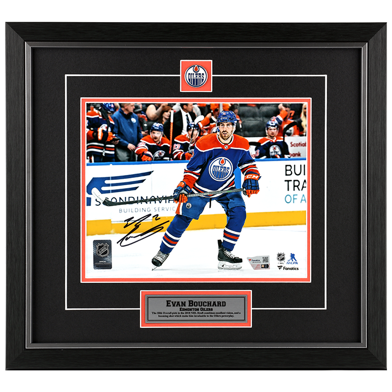 This photo has been hand signed by Evan Bouchard and will deliver with a Fanatics Hologram.