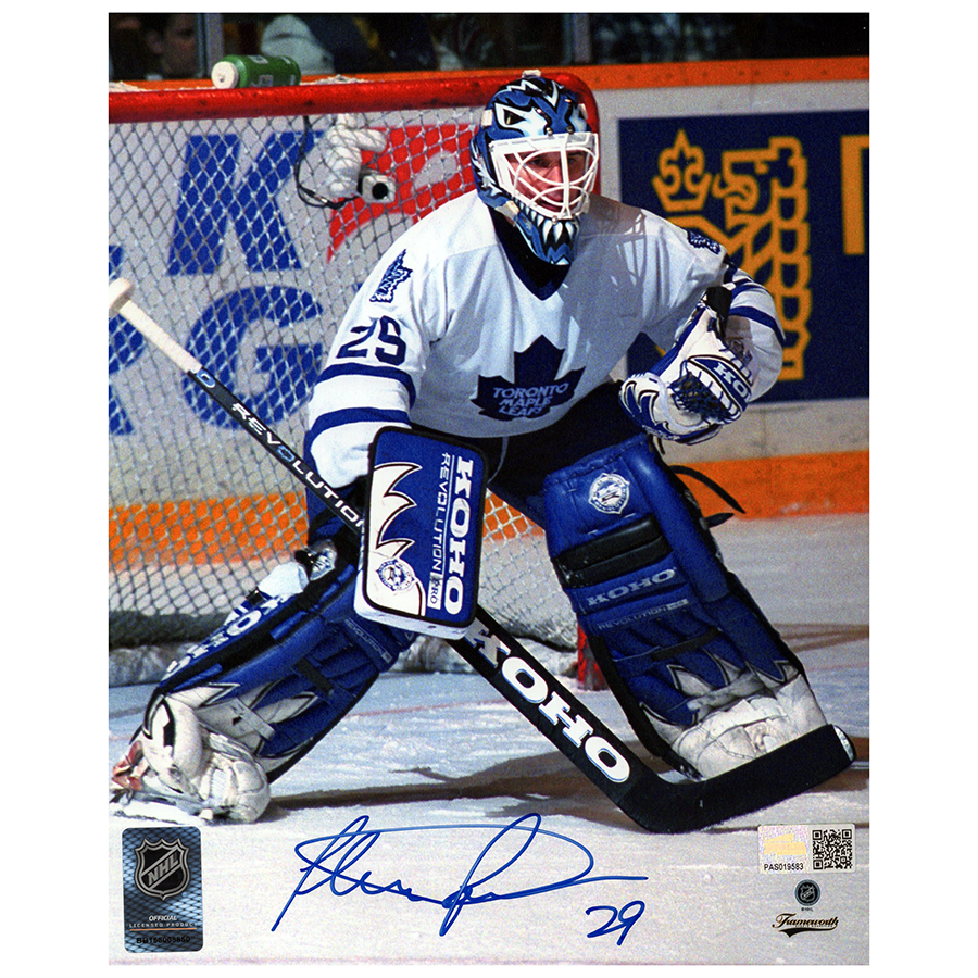 Felix Potvin Toronto Maple Leafs White Action - Watching The Play - Autographed 8x10 Photo.