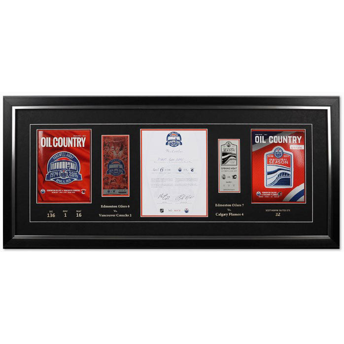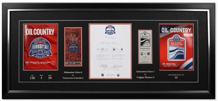 Frame Package for your Rexall Place Final Game Program, Certificate and Souvenir Ticket combined with Rogers Place Inaugural Game Game Programe and Souvenir Ticket and Etched Mats. will include your Section, Row and Seat Number along with Final Scores from each game.