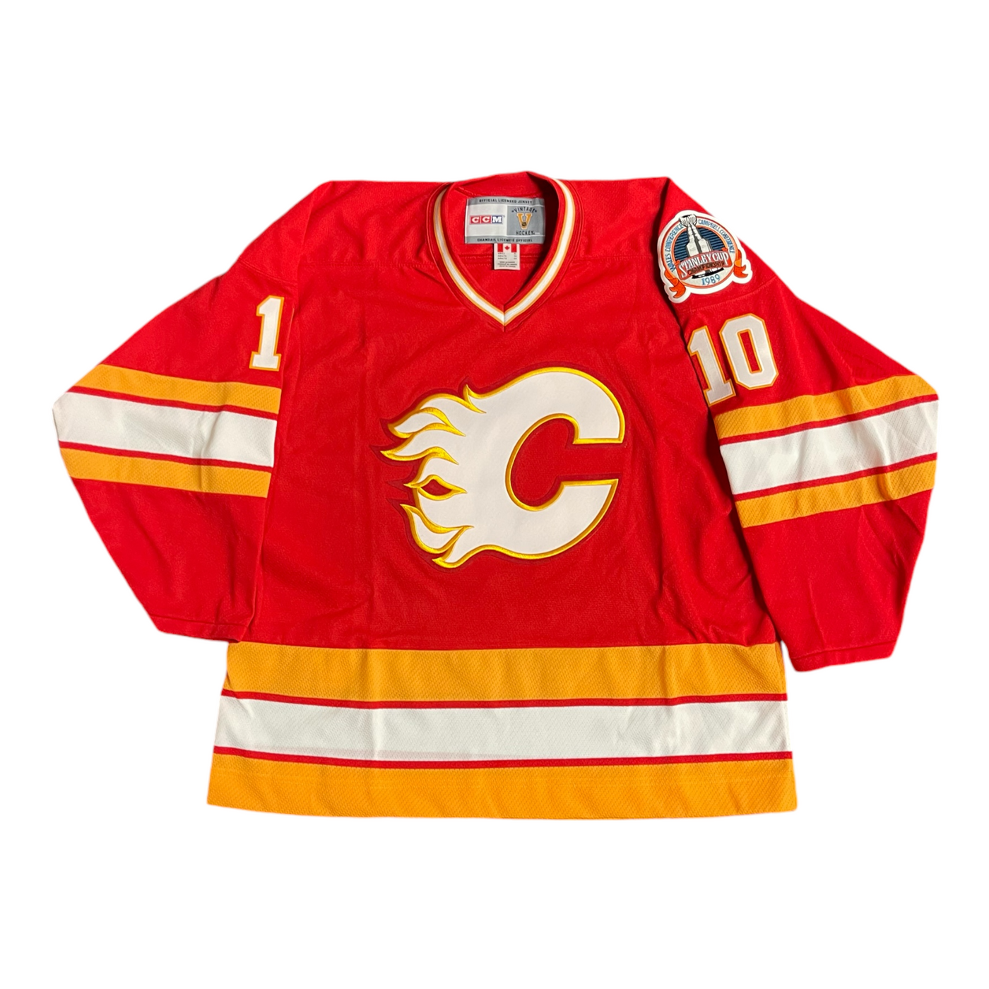 This vintage CCM replica jersey features the 1989 Stanley Cup Finals patch on the left shoulder.