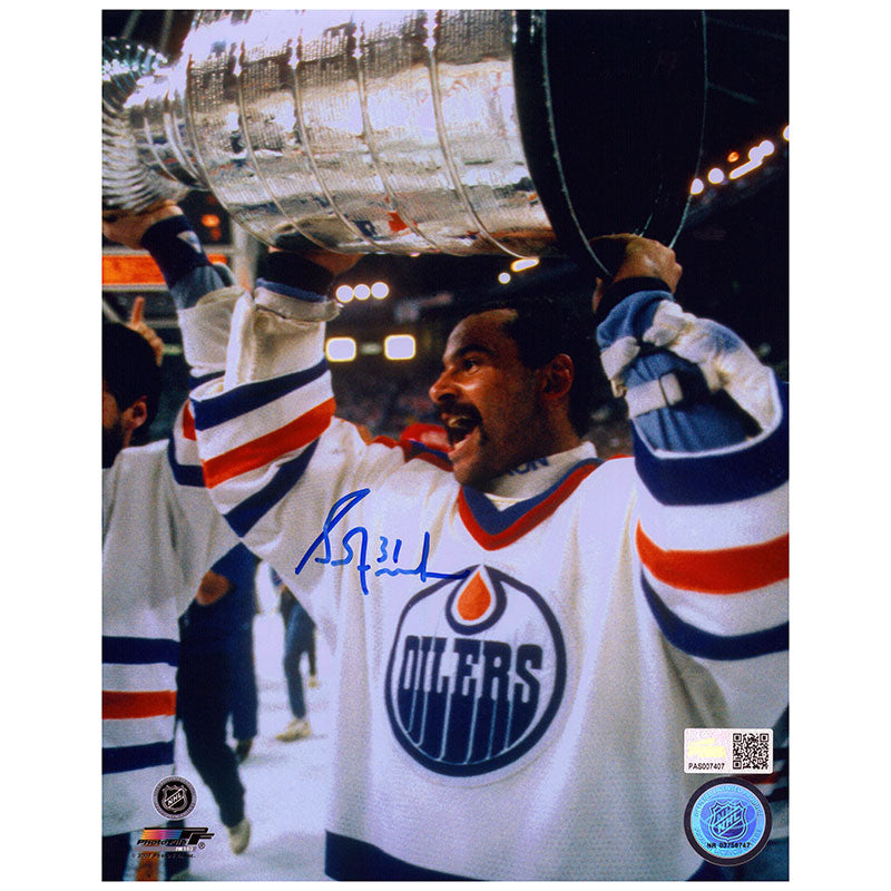 Grant Fuhr Edmonton Oilers White Action "Hoisting The Cup" Autographed 8x10 photograph