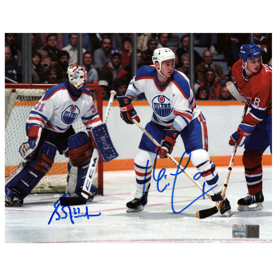 This photo was hand signed by Grant Fuhr, & Kevin Lowe, and will deliver with an individually numbered tamper-evident hologram from Pro Am Sports. To ensure authenticity the hologram can be reviewed online.