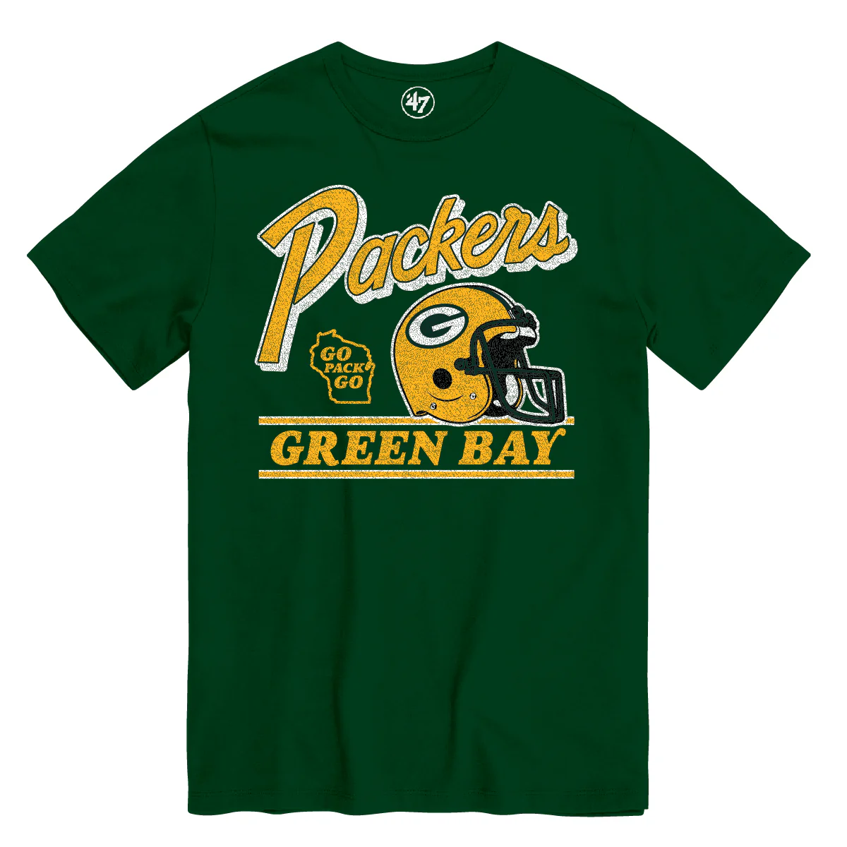 The Green Bay Packers '47 Fly By tee is a lightweight 100% cotton tee and features distressed retro inspired graphics and a classic crewneck fit.