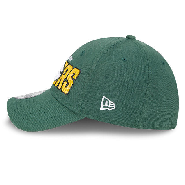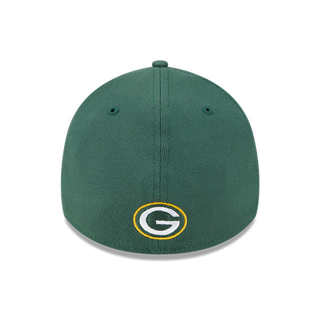 The Green Bay Packers 2023 Draft 39THIRTY Stretch Fit Cap features an embroidered Packers wordmark and logo at the front panels, matching NFL Shield at the right-wear side, team logo at the rear, and a gray undervisor.