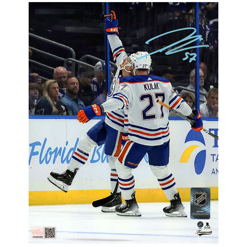 James Hamblin Edmonton Oilers Autographed Road White Action 1st NHL Goal Celebration 8x10 Photo.