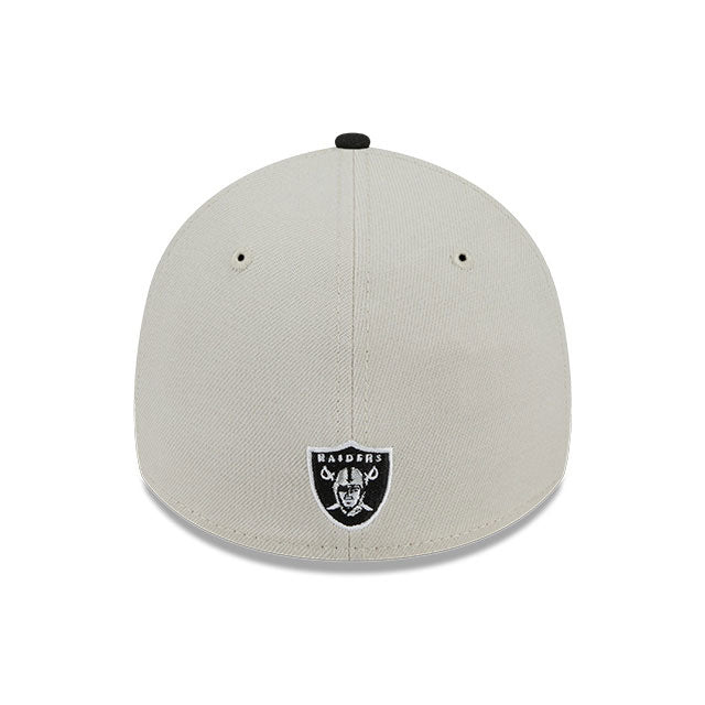 The Las Vegas Raiders 2023 Draft 39THIRTY Stretch Fit Cap features an embroidered Raiders wordmark and logo at the front panels, matching NFL Shield at the right-wear side, team logo at the rear, and a gray undervisor.