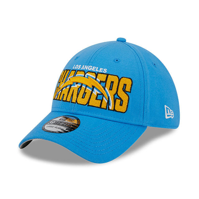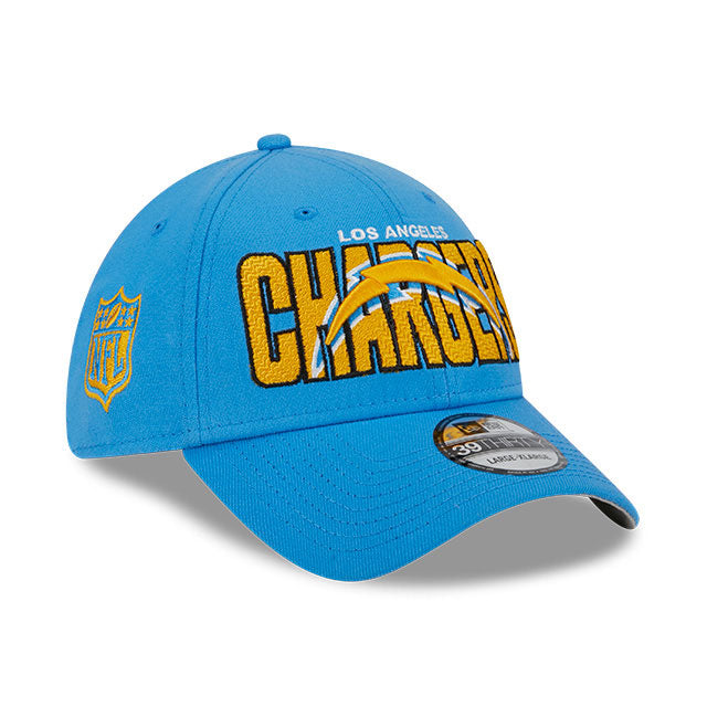 The Los Angeles Chargers 2023 Draft 39THIRTY Stretch Fit Cap features an embroidered Chargers wordmark and logo at the front panels, matching NFL Shield at the right-wear side, team logo at the rear, and a gray undervisor.
