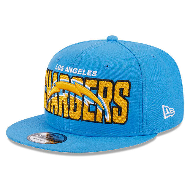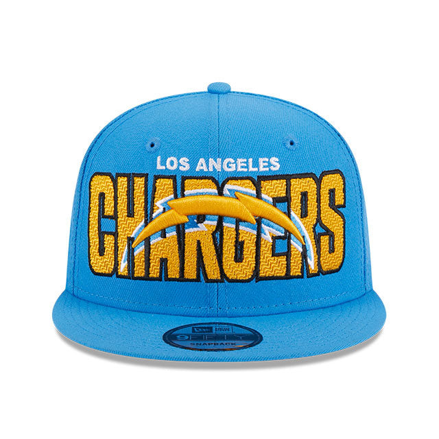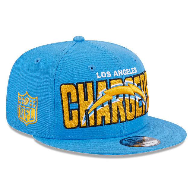 The Los Angeles Chargers 2023 Draft 9FIFTY Snapback features an embroidered Chargers wordmark and logo at the front panels, matching NFL Shield at the right-wear side, team logo above a snapback closure at the rear, and a gray undervisor.