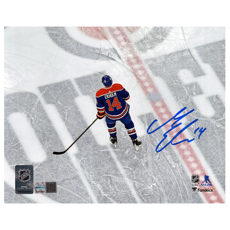 Mattias Ekholm Edmonton Oilers Autographed Home Royal Blue Action Overhead Center Ice Logo 8x10 Photo.