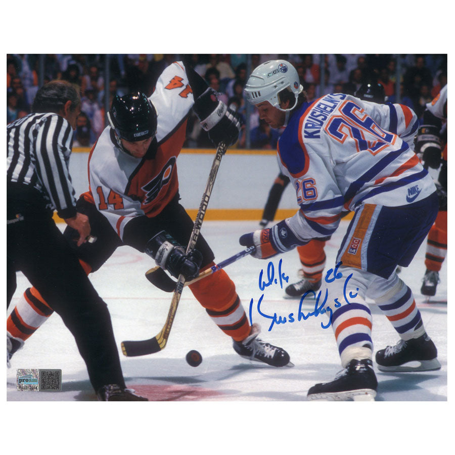 Mike Krushelnyski Edmonton Oilers White Action - Faceoff- Autographed 8x10 photograph.