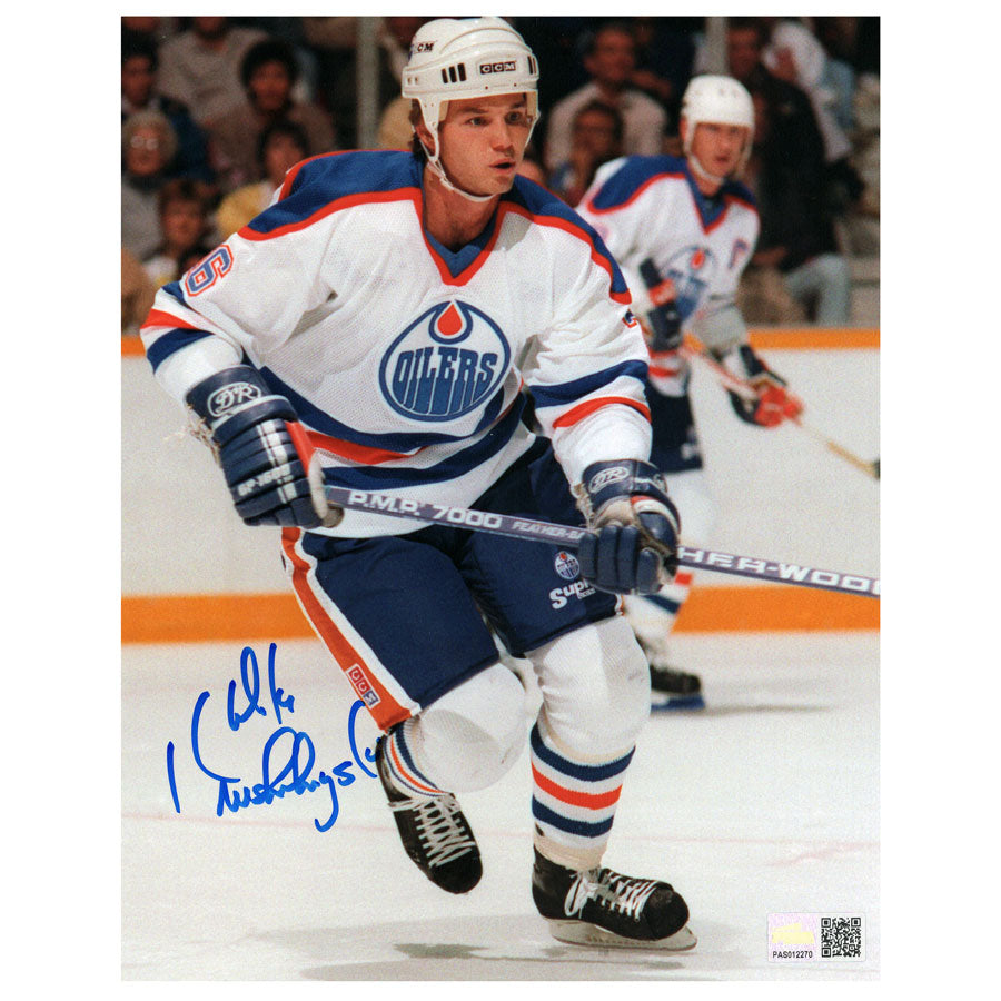 Mike Krushelnyski Edmonton Oilers White Action - Skating Up Ice - Autographed 8x10 photograph.