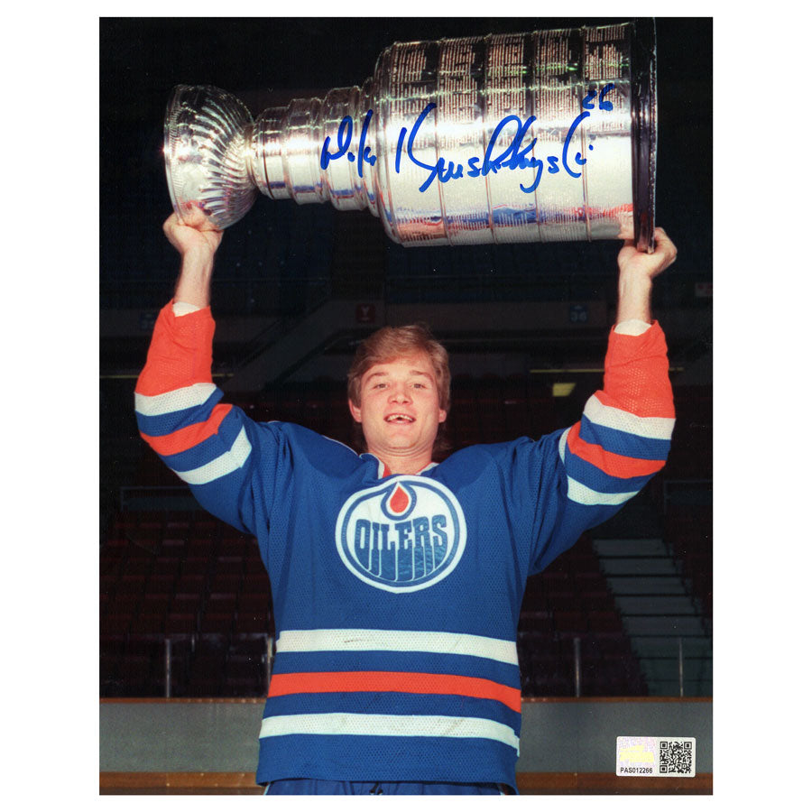 Mike Krushelnyski Edmonton Oilers Blue Posed - Stanley Cup Overhead - Autographed 8x10 photograph.