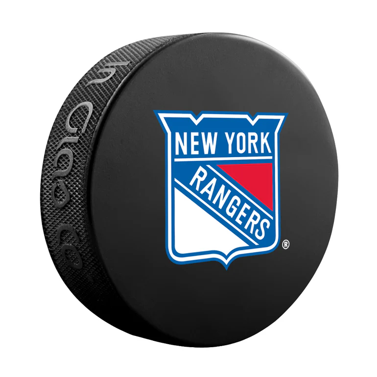 This black souvenir puck features the New York Rangers' logo boldly filling the face of the puck.