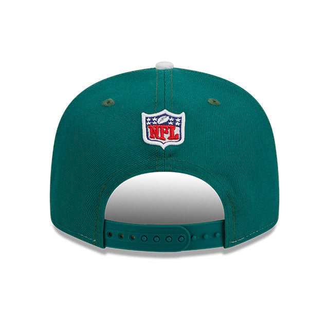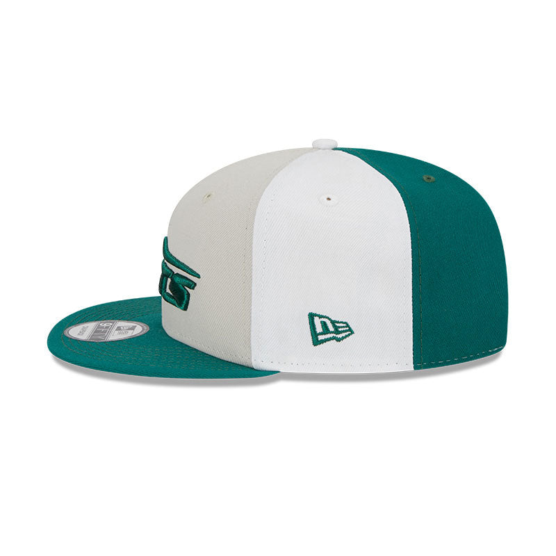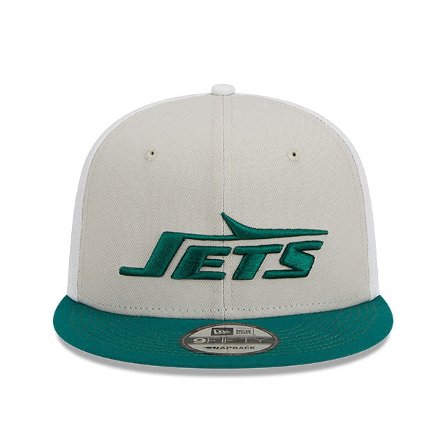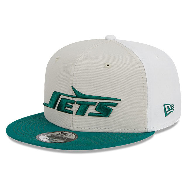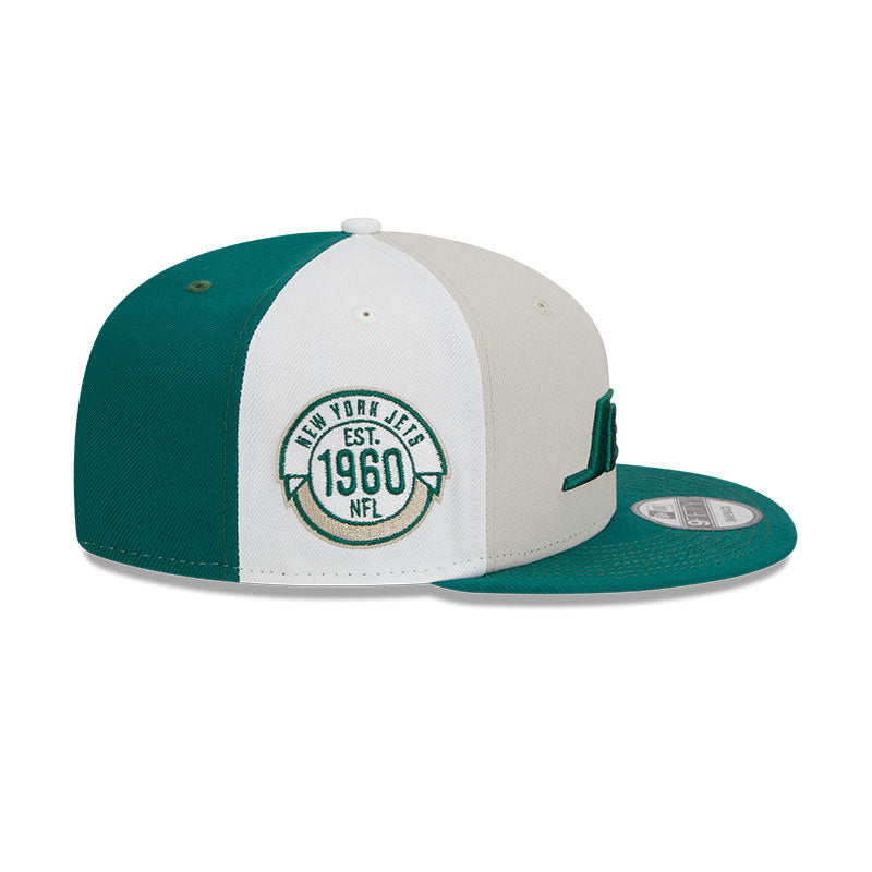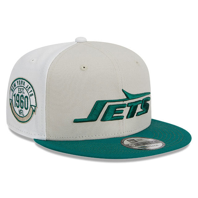 The New York Jets 2023 Sideline Historic 9FIFTY Snapback features an embroidered Jets historic logo at the front panels with the official NFL Shield above a snapback closure at the rear. Additional details include a patch with the team's established year at the right-wear side and a gray undervisor.