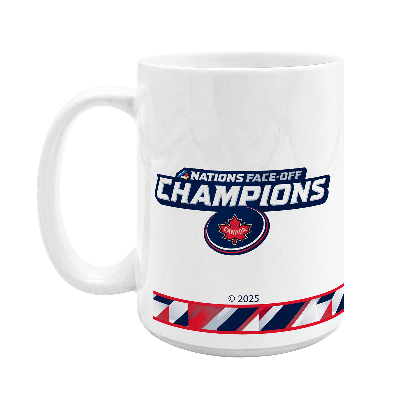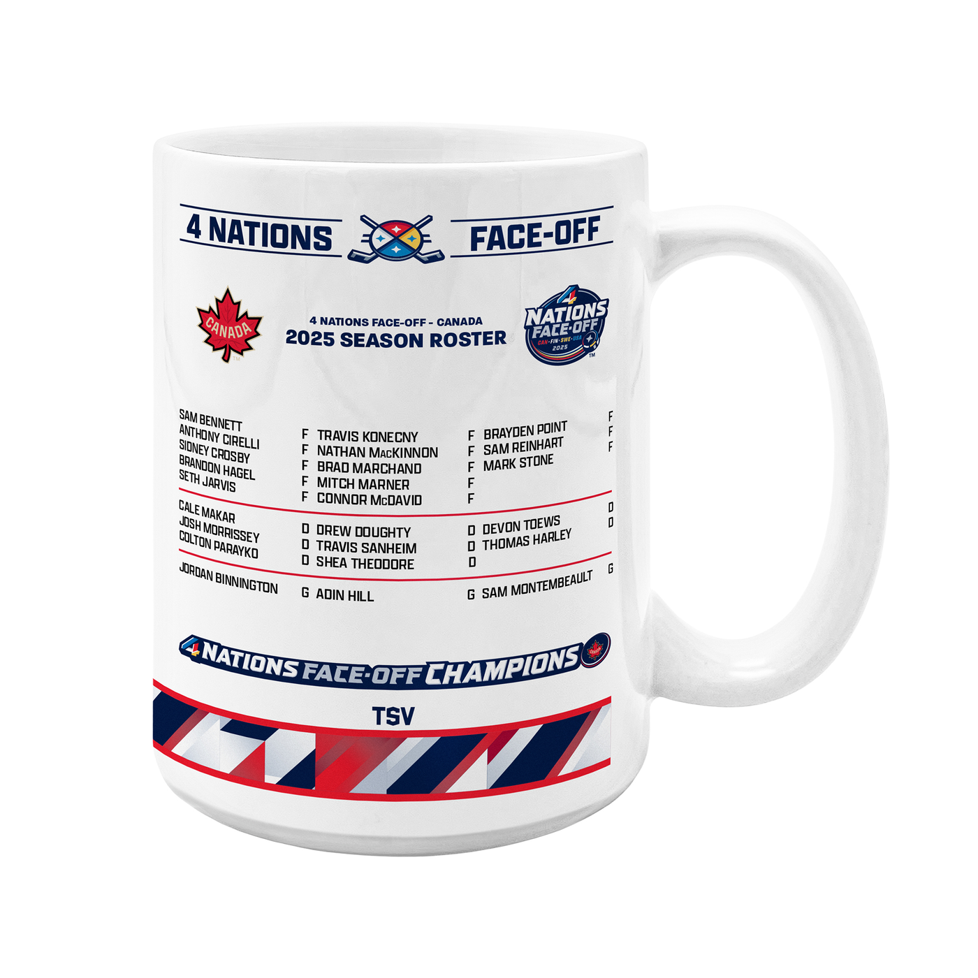 Start your morning off with a hot cup of Championship! This 15oz. "Roster" Mug is the perfect addition to your collection with bold Canada 4 Nations Champions graphics on one side and the roster on the reverse.