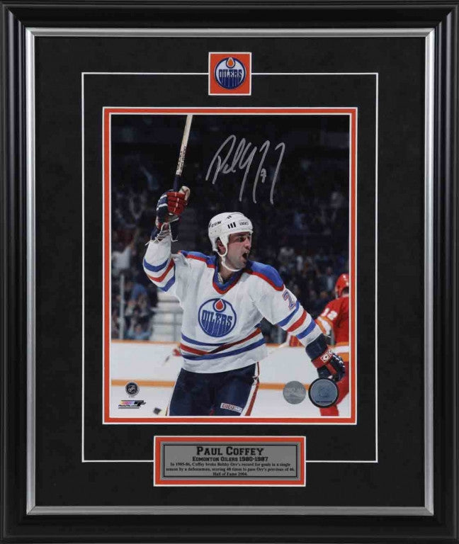 Paul Coffey Autographed Edmonton Oilers Home White Action "Goal Celebration vs. CGY" Autographed 11x14 Framed Photo.