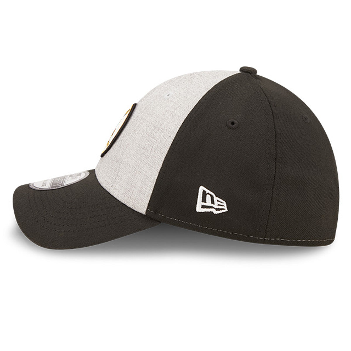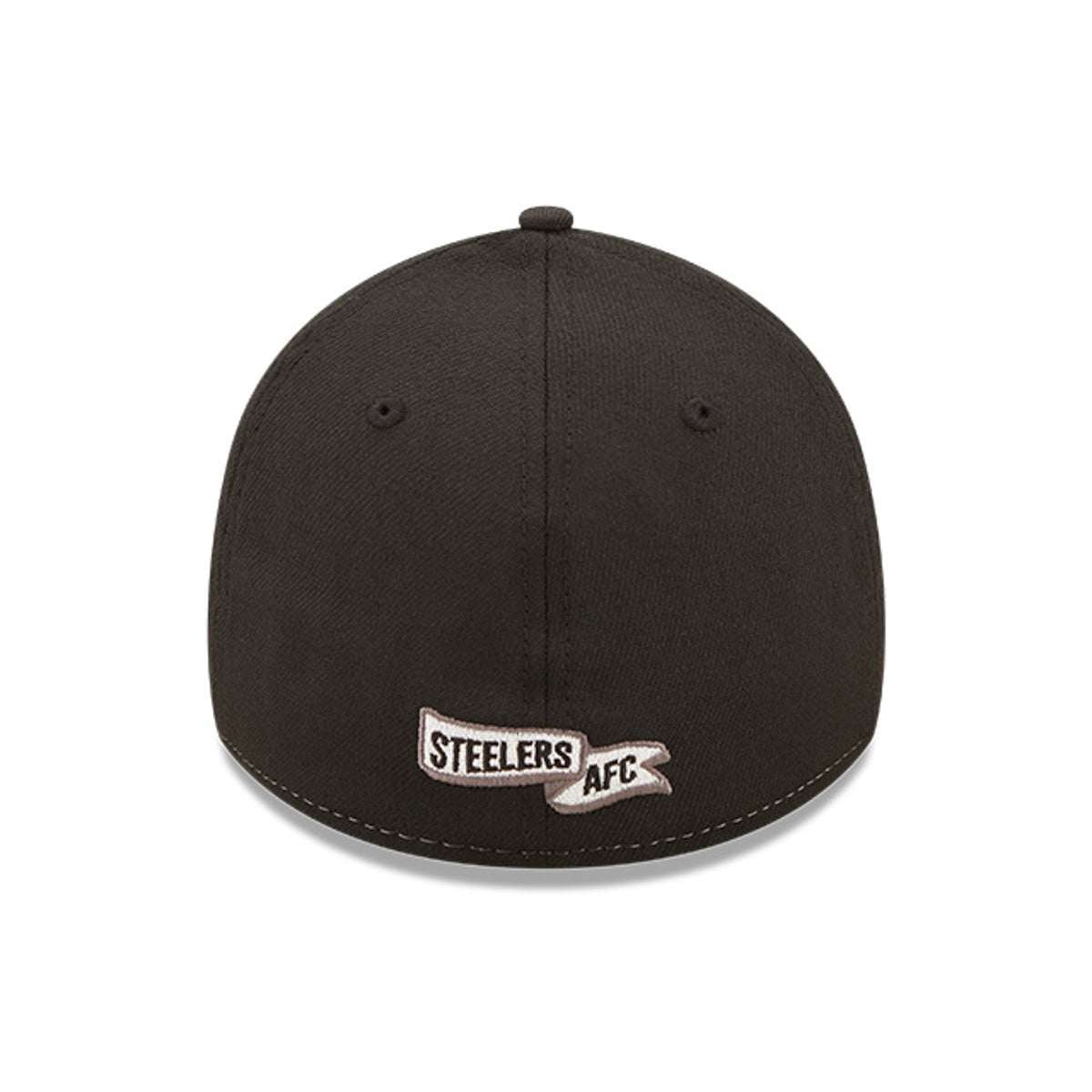 The Pittsburgh Steelers 2022 Sideline Historic 39THIRTY Stretch Fit Cap features an embroidered retro Steelers logo at the front panels, the NFL Shield at the right-wear side, and a conference banner at the rear.