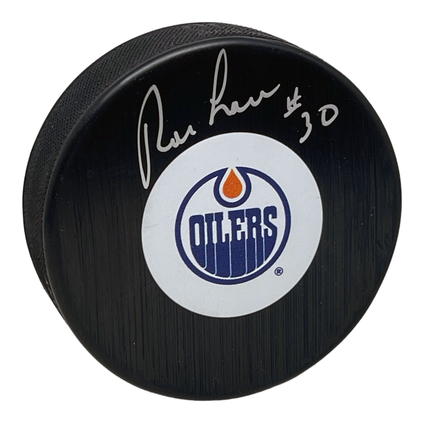 Ron Low Signed Edmonton Oilers Puck Mid Size Logo