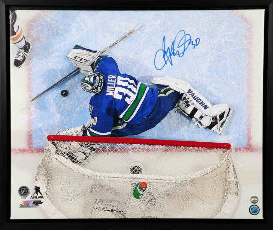 Ryan Miller Vancouver Canucks Blue Action "Overhead" Autographed 20x24 Framed Canvas.