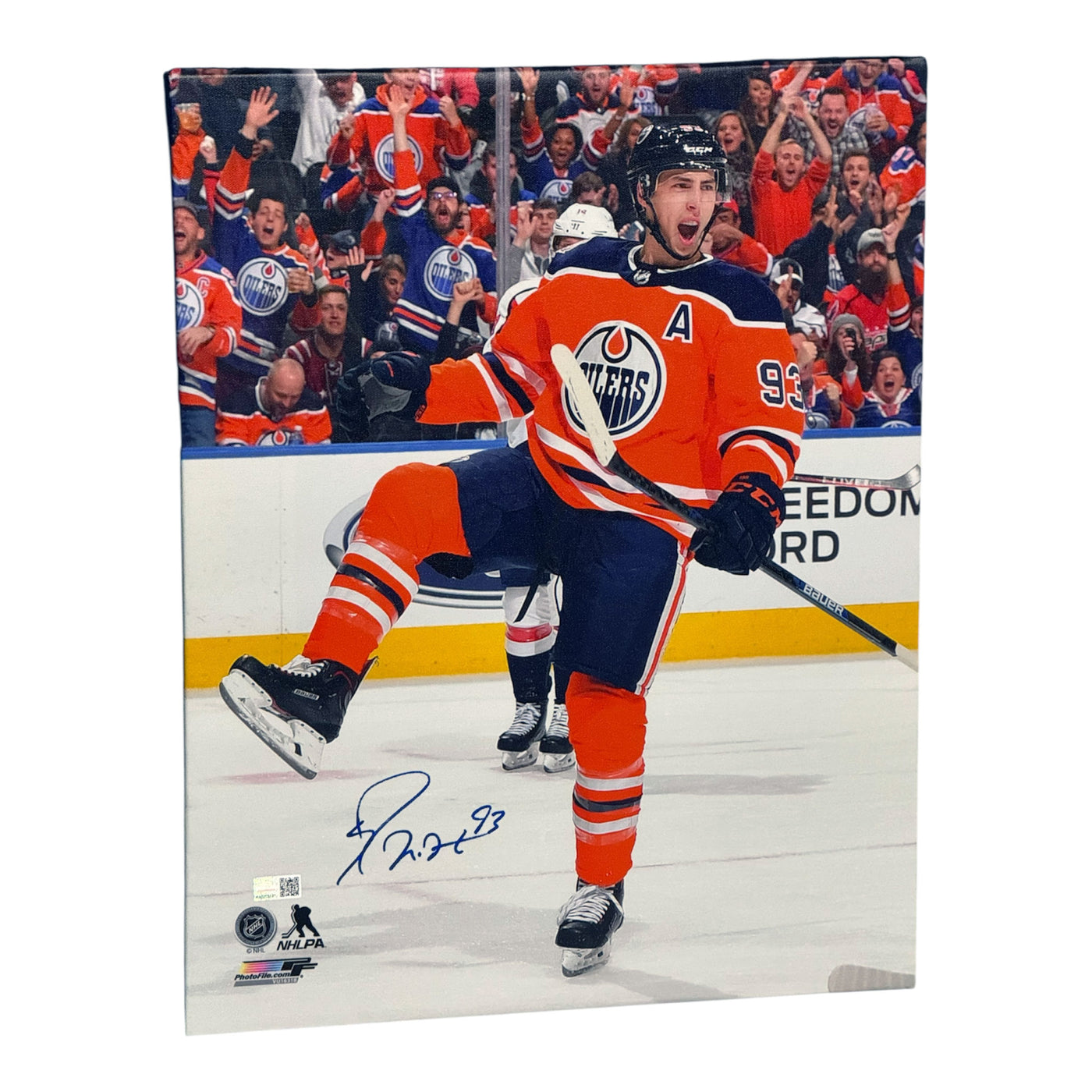 This canvas was hand signed by Ryan Nugent-Hopkins, and will deliver with an individually numbered tamper-evident hologram from Pro Am Sports. To ensure authenticity the hologram can be reviewed online.