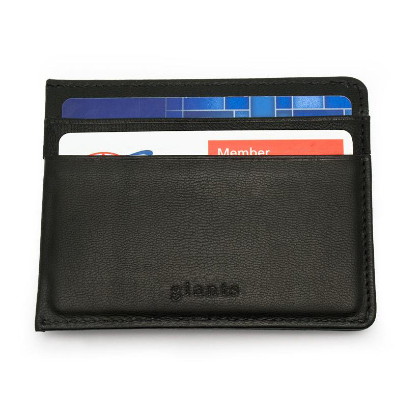 - Wallet is top quality goat leather with polyester lining. Slim and light-weight with 2 card slots on back and inner pocket. Magnetic money clip on front. A metal plate is sewn into the wallet to protect magnetic cards. Measures 3" x 3-7/8". "Giants" is debossed on the back.