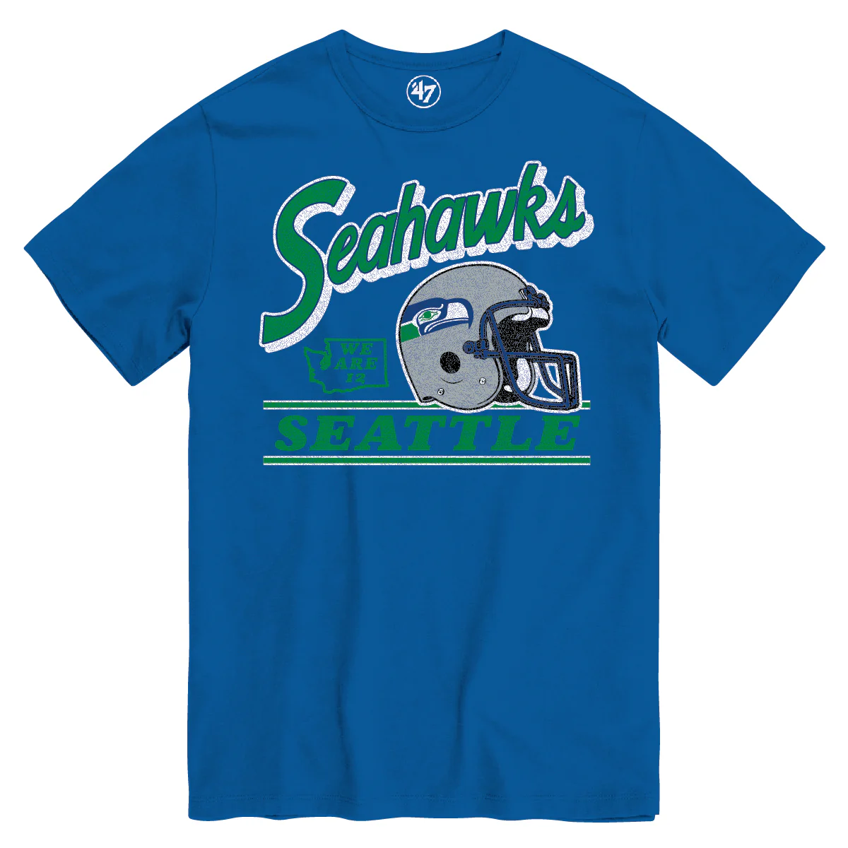 The Seattle Seahawks '47 Fly By tee is a lightweight 100% cotton tee and features distressed retro inspired graphics and a classic crewneck fit.