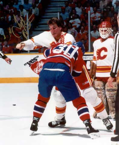 Tim Hunter Calgary Flames White Action "Fighting Chris Nilan" autographed 11x14 photograph