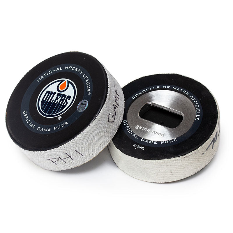 - This bottle opener is crafted from an authentic regular season game used Edmonton Oilers hockey puck.