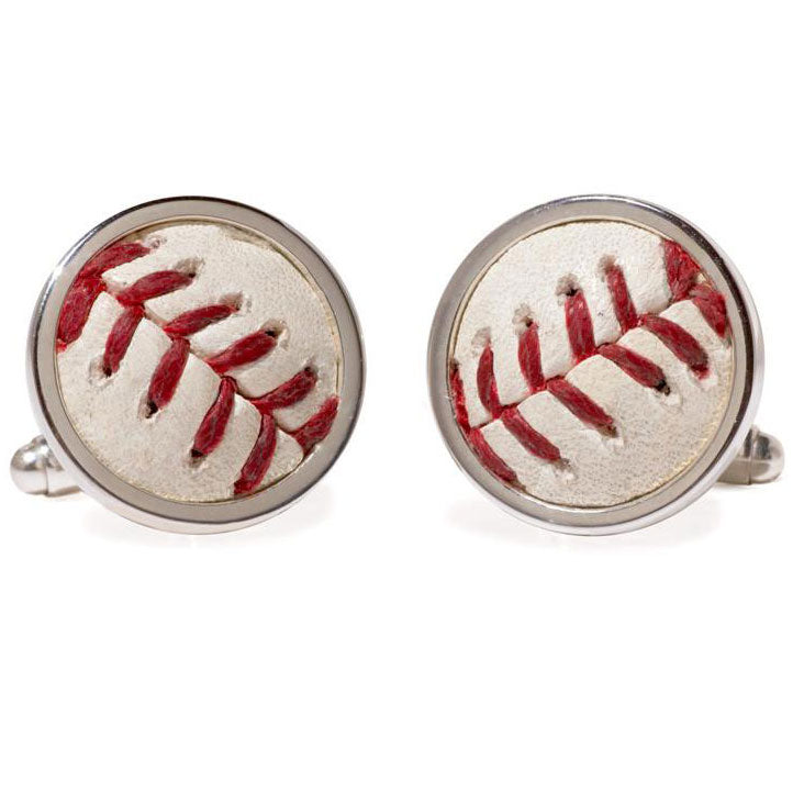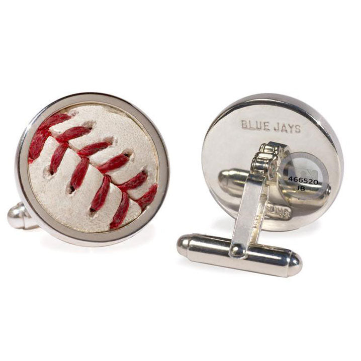 - Set in sterling silver with swivel findings, these cuff links feature the unmistakable red stitching and the little scratches and scuffs that let you know they have seen game-play. Measures 7/8" in diameter and back hallmarked "Blue Jays"